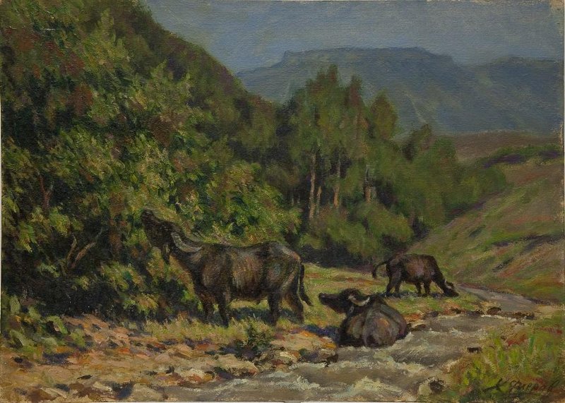 У кустов, на берегу быстрой мелкой реки три буйвола: на первом плане буйвол объедающий листву с деревьев, лежащий в воде буйвол изображен сзади, вдали пасущийся буйвол.