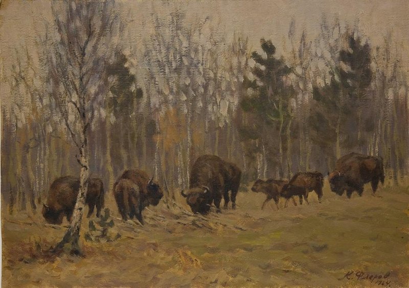 На листе горизонтального формата изображен осенний пейзаж с шестью пасущимися зубрами, слева на первом плане берёза с опавшей листвой.
