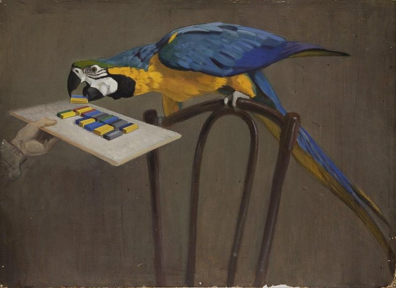 На листе горизонтального формата, на сером фоне изображен попугай с желтым туловищем и шеей, синей спинкой, хвостом и крыльями, зелёным белым и черным пятнами на голове. Он сидит на спинке венского стула, обращен влево, его фигура горизонтально вытянута, он тянется к дощечке с прямоугольными разноцветными брусками. Видна кисть женской руки, держащей дощечку. Попугай выбрал сине-желтый брусок.
