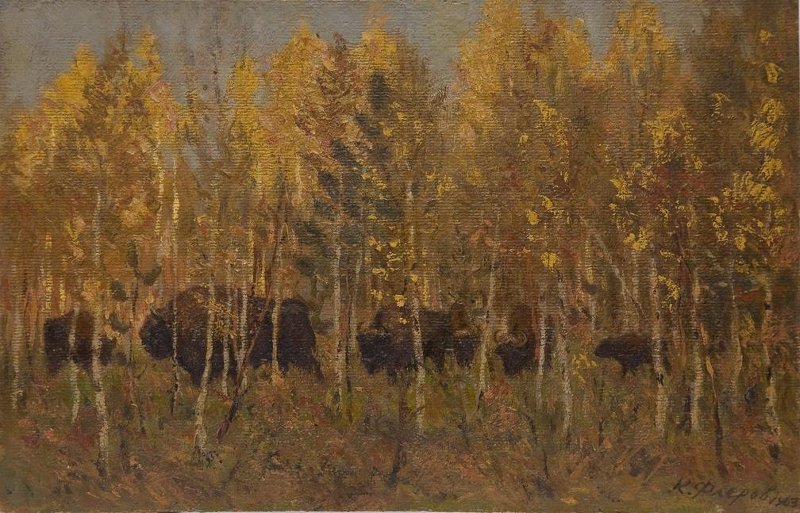 На картоне горизонтального формата выполнен осенний лесной пейзаж со стадом, идущих между молодых берёз, зубров. Изображено шесть зубров на втором плане, пятеро взрослых и зубрёнок.