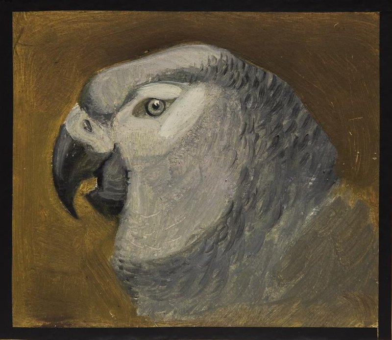 На листе квадратного формата, на кориневом условном фоне изображена голова попугая жако в профиль влево. Оперение от тёмно-серого на верхней части головы до светло-серого у клюва. Клюв черный, приоткрыт.