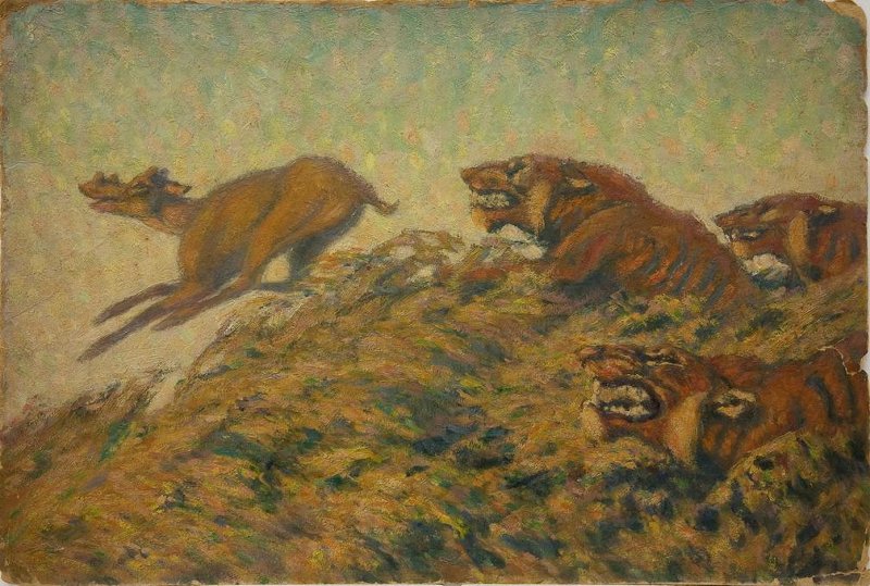 На картоне горизонтального формата изображена погоня трёх эндрюсархусов за копытным животным, расположенным в левой части листа. Животные стремительно движутся с права налево, добыча изображена в скачке, видны все четыре конечности, преследователи утопают в высокой траве, хорошо видны только их головы с огромными раскрытыми пастями. Их шерсть рыжая и покрыта полосками, как у тигров.