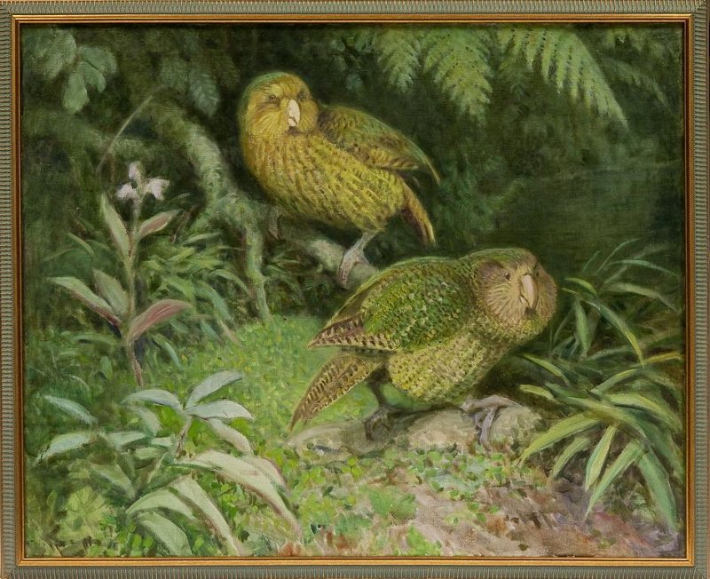 На холсте горизонтального, почти квадратного формата, на фоне темно-зелёной тропической растительности изображены два совиных попугая (какапо) – две пестрые, зеленоватой окраски, округлых форм, птицы со светлыми клювами и лапами. Один из них сидит на изогнутой ветке в три четверти влево, но его голова повёрнута вправо. Второй расположен левее, он изображен боком головой вправо. На первом плане растительность светлых тонов с узкими длинными листьями, слева растение с тремя небольшими зеленовато-белыми цветками, на дальнем плане виден папоротник.