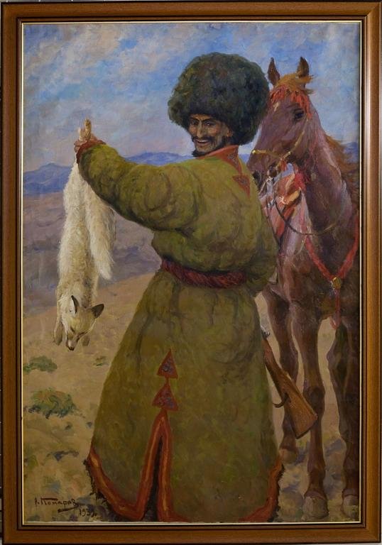 На первом плане картины вертикального формата изображен почти в полный рост охотник-туркмен со своим трофеем – убитой лисой. Человек стоит, повернувшись к зрителю несколько боком и спиной. Он смотрит на зрителя через плечо, улыбаясь. Подол его халата обрезается рамой картины. В правой руке охотник держит ружье деревянным прикладом вниз, а левой вытянутой рукой поднимает за задние лапы небольшую светлую песчано-желтую лису. Человек одет в оливково-зеленый халат, подпоясанный красно-синим кушаком и в черную лохматую шапку-папаху. Ворот халата, обшлага рукавов и подол обшиты красной материей. На спине под воротом вшиты два пестрых треугольника с красными краями остриями вниз. Такие же два треугольника, но остриями вверх пришиты у бокового разреза халата на подоле. Справа от охотника стоит гнедая ахалтекинская лошадь, в нарядной красной сбруе, украшенной кисточками. Действие разворачивается на фоне выжженной песчаной пустыни, с редкими клочками зеленой растительности. На первом плане земля охристо-желтая, а вдали – розовато-фиолетовая. На горизонте видны голубые горы. Небо розовато-голубое, словно в легкой облачной дымке. Краски наложены плотно, пастозно, фактура мазка хорошо видна.