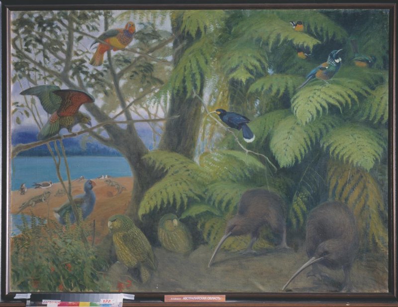 Иллюстрация фауны Ново-Зеландской подобласти. На картине горизонтального формата изображен пейзаж с мощными деревьями тропического леса и папоротниками справа, ярким голубым водоёмом слева и уходящим в синюю дымку лесом на дальнем плане. На первом плане справа крупно изображены две коричневые птицы киви с длинными узкими клювами, левее два зелёных совиных попугая, в левом углу за веткой на фоне песчаного берега изображена султанская курица. На песчаной косе отдыхают ящерицы (или крокодилы) и птицы буревестники. В верхнем левом углу на ветвях изображены два яркоокрашенных попугая нестора, один из них с поднятыми крыльями. В верхнем правом углу птицы медососы и мухоловка.