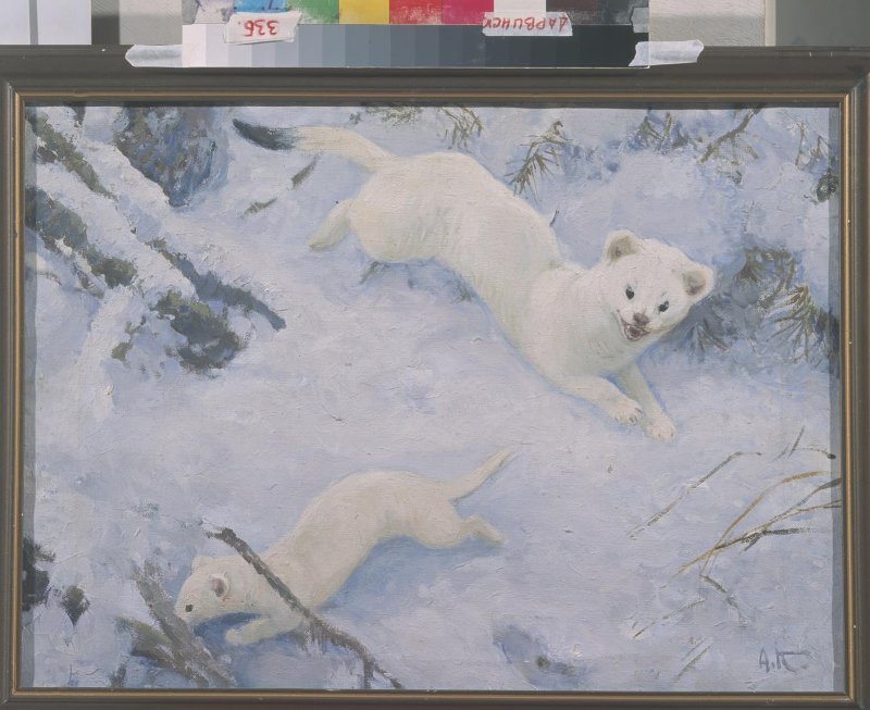 На картине горизонтального формата изображен горностай, преследующий ласку в зимнем лесу. Основная колористическая гамма холодная. Внизу слева ласка в своем белом зимнем наряде стремительно убегает от преследующего ее хищника и собирается юркнуть под заснеженный валежник. Справа вверху изображен горностай: злобно оскалившись, он гонится за лаской. Окраска горностая также сплошь белая, только кончик хвоста черный. В приоткрытой розовой пасти хищника видны мелкие белые зубы. Снег, покрывающий землю, голубовато-белый. За горностаем виднеются заснеженные еловые ветки. Краски наложены плотно, пастозно, фактура мазка хорошо видна.