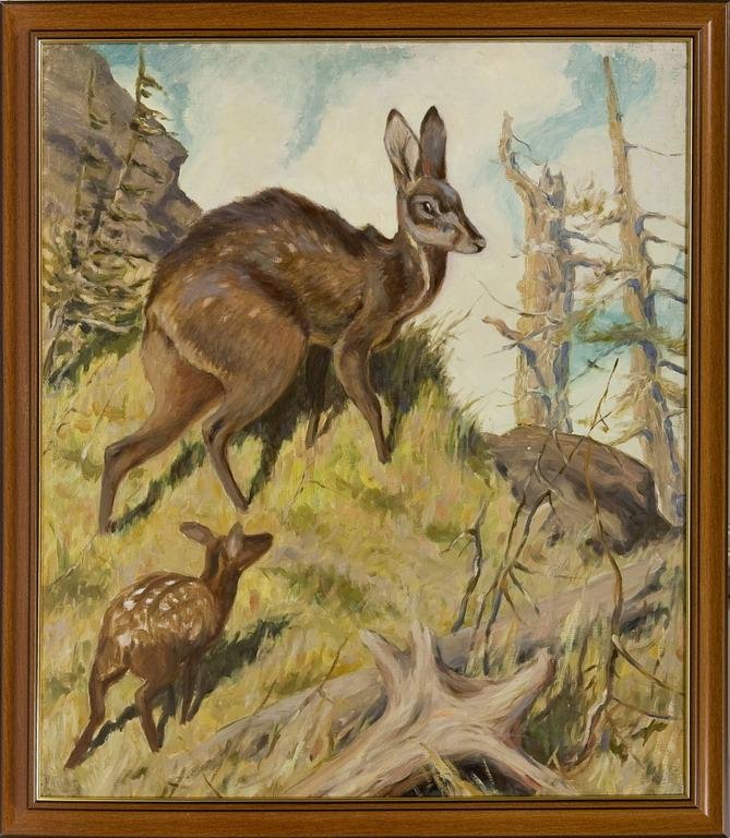 Полотно вертикального формата, основная колористическая гамма теплая. На картине изображена кабарга со своим детенышем. На первом плане слева стоит детеныш кабарги. Его рыжевато-коричневая спинка покрыта белыми пятнами, на шее также видны темные полосы. Детеныш смотрит вглубь картины, туда, где на пригорке, покрытом желтовато-зеленой травой, стоит в настороженной позе взрослая кабарга. Она изображена сбоку, уши ее подняты вертикально. Шкура кабарги написана различными оттенками коричневого, причем на спине она становится темнее. На шее видна белая полоса, а вот светлые пятна на спине едва заметны (это небольшие вкрапления светло-коричневого цвета). В правом нижнем углу картины изображены два упавших древесных ствола. Слева на заднем плане видна серая скала, перед которой растут два тонких деревца. Справа, за большим валуном стоят два больших засохших дерева, причем одно из них со сломанной верхушкой. Линия горизонта не видна. В просветах между белыми облаками виднеется голубое небо. Краски наложены плотно, пастозно, фактура мазка хорошо видна. В правом верхнем углу на изображении неба оставлен участок не закрашенного белого грунта.