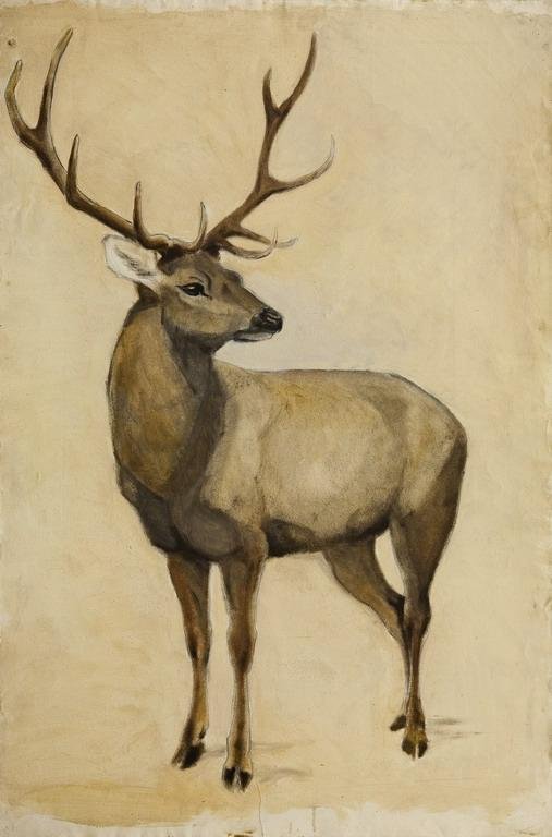 На листе вертикального формата, на условном светло-бежевом фоне изображен стоящий олень с большими ветвистыми рогами. Он стоит боком головой влево, его голова развёрнута в три четверти вправо, гордо поднята. Окрас светлый коричневато-сероватый. У копыт легкая тень.