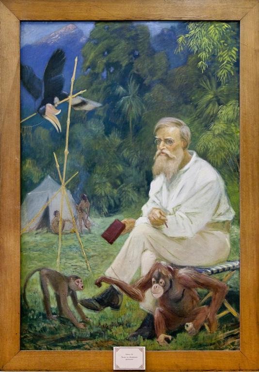 На картине вертикального формата изображен на фоне тропического леса А.Уоллес. Основная колористическая гамма полотна холодная. На первом плане композиции справа Уоллес сидит на раскладном стульчике с полосатым бело-синим тканевым сиденьем, положив ногу на ногу и опустив скрещенные руки на колени. У него светло-русые волосы и борода, он одет в белую рубашку и светлые бежевые брюки. В левой руке ученый держит маленькую темно-красную книжечку, а в правой – карандаш. Взгляд его устремлен на маленького рыжего детеныша орангутана, который сидит перед ним на земле, протягивая свою правую руку к испуганно отпрянувшему маленькому макаку. На втором плане слева расположен высокий бамбуковый насест, на котором сидит на привязи птица-носорог. Взмахнув крыльями и опустив голову вниз, она следит за обезьянами. На третьем плане слева стоит светлая палатка-шатер, перед которой виднеются две обнаженные фигуры туземцев. Один из них сидит на земле, второй стоит, повернувшись спиной к зрителю. Перед ними горит костер. За шатром стеной стоят высокие тропические деревья. Слева над ними поднимается верхушка далекой синей горы, а над нею виднеется кусочек голубого неба. Краски наложены тонкими лессировочными слоями. Холст состоит из двух половин, у левого края картины проходит вертикальный шов.