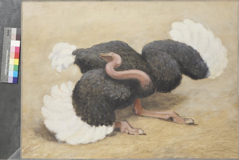 Страус (ток). [Страус самец в токовой позе]. Картина