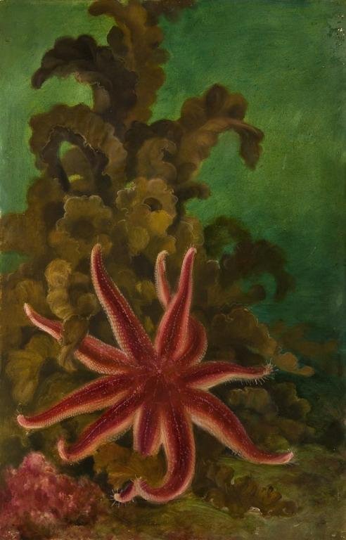 Картина вертикального формата, основная колористическая гамма холодная. На первом плане в нижней части картины изображена крупная темно-красная солнечная морская звезда с десятью лучами. Она полулежит, опираясь на большой куст зеленовато-коричневых водорослей с широкими волнистыми листьями. По краям изгибающихся лучей солнечной морской звезды виднеются тонкие светлые амбулакральные ножки, служащие для передвижения. В левом нижнем углу на зеленовато-сером морском дне лежит неопределенная розовато-красная масса. Толща морской воды в верхней части картины имеет изумрудно-зеленый оттенок, несколько темнеющий к низу. Краски наложены тонкими лессировочными слоями, фактура мазка не видна.