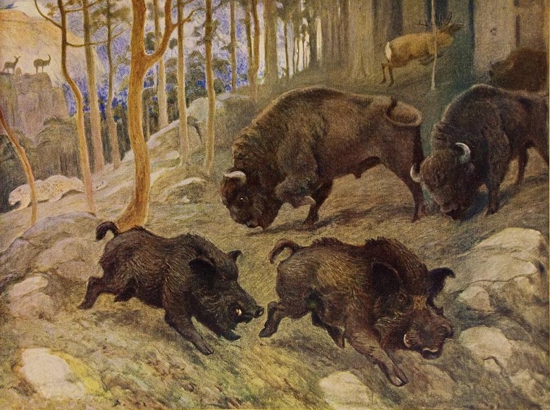 На картине горизонтального формата представлен гористый лесной пейзаж с каменистым склоном на первом плане. Иллюстрация, изображающая животный мир восточной части Средиземноморской области (лесная зона Кавказа). На первом плане по склону слева направо бегут два кабана, выше них и правее стоят два зубра, изображенные боком головой влево, позади них на фоне стволов виден третий зубр. В верхнем правом углу картины, левее зубров изображен бегущий слева направо персидский олень за светлым тонким стволом деревца. Слева на среднем плане за тонкими стволами деревьев изображена крадущаяся справа налево светлая пантера, почти сливающаяся по цвету с каменистой почвой. На дальнем плане на горных уступах слева изображены силуэты туров, правее сквозь стволы деревьев просвечивает кобальтовое небо.