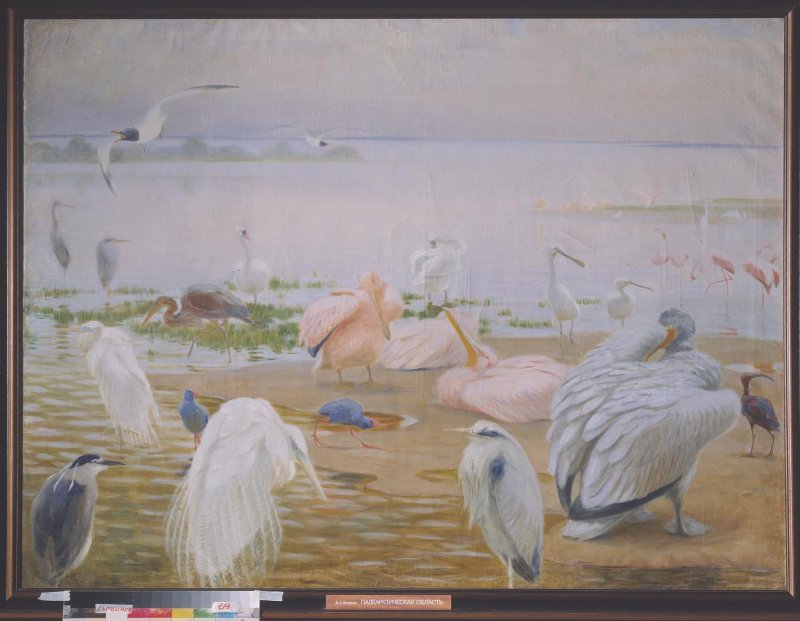 На картине горизонтального формата представлен берег Каспийского моря густо населённый болотными и водными птицами. ¾ холста занимает водная гладь с песчаной косой, ¼ занимает небо. В центре композиции пеликан кудрявый розовый; на первом плане цапли серые, белые, слева в углу ночная цапля (кваква) и красная цапля. На среднем плане колпицы, левее фламинго. Каравайка справа от кудрявого пеликана. Султанская курица за белыми цаплями. В полёте над гладью воды слева большая чайка. Лебеди шипуны на земляных кочках в воде.
