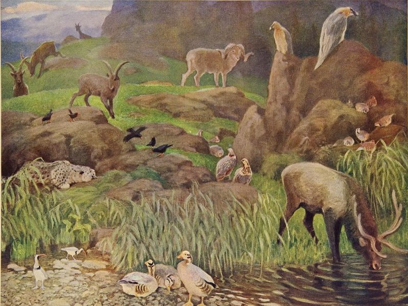 На картине горизонтального формата представлен пейзаж горной части среднеазиатской области. На первом плане справа небольшой водоём, далее каменистый пологий склон с камнями и светло-зелёной травой, скалы на дальнем плане, высокий горизонт. На первом плане у водоёма изображен бухарский олень, слева подкрадывающийся к добыче барс, на среднем плане сибирский горный козёл, горные бараны. На первом плане в центре индийский гусь, справа на скалах два бородача, ниже горные индюки, горные курочки, кулики серпоклювы, альпийская галка.