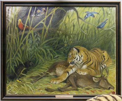 На картине горизонтального формата на фоне пейзажа с мощным деревом и высокой желто-зелёной травой изображены представители животного мира Манчжурии и Уссурийского края. На первом плане крупно изображен лежащий на туше пекинского оленя тигр. Слева изображены енотовидная собака и желтая мухоловка. На дереве у входа в дупло изображены две утки-мандаринки, на ветке слева - золотой фазан, на другой ветке - две сизоворонки.