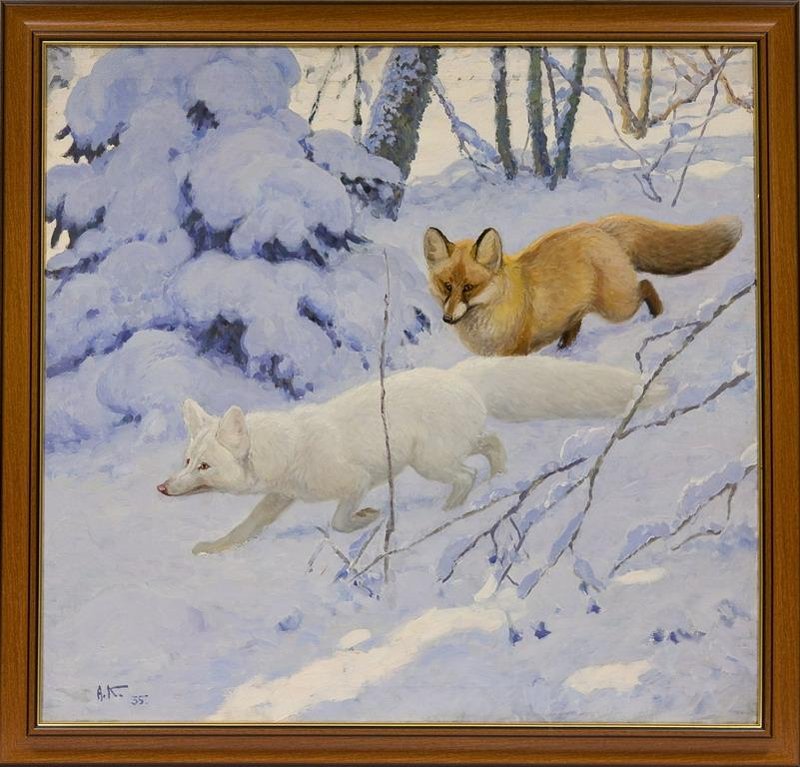 Формат полотна горизонтальный, близок к квадрату. По зимнему лесу пробираются справа налево две лисы: на первом плане – абсолютно белая лисица альбинос, за ней следует светло-рыжая. За ними видны заснеженная ель и стволы деревьев. Передний план погружен в тень, только кое-где на светло-голубом снегу лежат блики солнечного света. Краски наложены пастозно, фактура мазка хорошо видна.