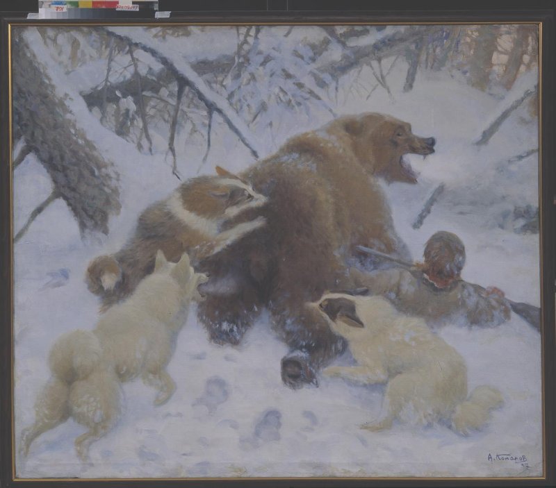 На холсте квадратного формата, на фоне заснеженного леса, у поваленных стволов елей, изображены три лайки, нападающие на медведя. Медведь, изображенный со спины с головой повёрнутой вправо, подмял под себя охотника с ружьём.