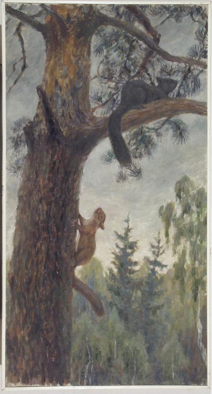 На картине вертикального формата изображены две белки в летнем лесу. Сверху на ветке сосны, на фоне ее темно-зеленой хвои, лежит черная белка - меланист. Ее пушистый хвост свободно свисает вниз. Снизу к ней по древесному стволу поднимается нормально окрашенная рыжая белка. В нижней части картины изображен дальний лес, где на фоне светло-зеленых лиственных деревьев выделяются темно-зеленые ели. Небо над лесом серое, пасмурное, чуть розовеющее к горизонту. Краски наложены пастозно, раздельными мазками, между которыми местами просвечивает не закрашенный белый грунт.