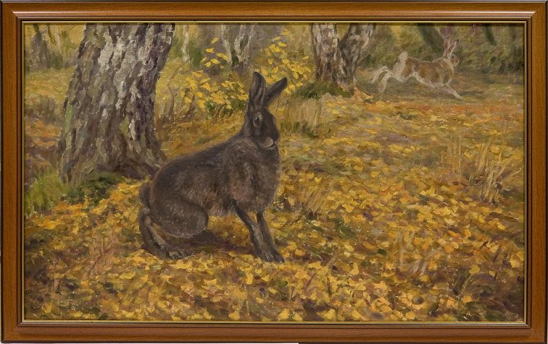 На картине горизонтального формата изображены два зайца в березовом лесу: нормально окрашенный и меланист. Основная колористическая гамма полотна теплая. На первом плане изображен сидящий на желтой опавшей листве у основания березы заяц-меланист. Уши его стоят торчком, передние лапы аккуратно поставлены рядом, в то время как задние полусогнуты. Окраска зайца необычна – он темно-серый, почти черный с коричневатым оттенком. Вся земля покрыта опавшей желтой листвой, написанной мазками желтого, коричневого и зеленого. Справа на втором плане среди берез скачет слева направо светлый коричневато-серый заяц. Дальний план - желтовато-зеленый. Краски наложены пастозно, но кое-где между раздельными мазками просвечивает белый грунт.
