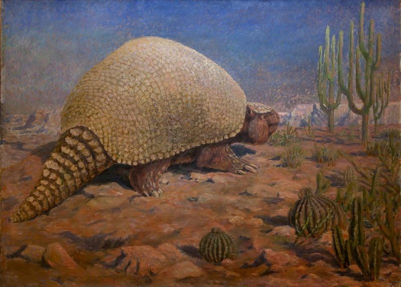 На картине горизонтального формата изображен глиптодон – представитель вымершего семейства гигантских броненосцев, обитавший в Южной Америке. Основная колористическая гамма полотна теплая. Глиптодон ползет слева направо по выжженной солнцем глинистой равнине, где растут только различные кактусы. Все его тело прикрывает сверху толстый охристо-желтый панцирь, состоящий из сросшихся друг с другом многочисленных костных пластинок. На голове также виден костный щит. Хвост глиптодона защищен сросшимися друг с другом костными кольцами. Голова и ноги животного покрыты рыжевато-коричневым мехом. На лапах видны длинные светлые когти. Земля на первом плане красновато-охристая, падающие тени написаны синим. Справа на первом плане изображены различные кактусы. На горизонте виднеются светлые розовато-голубые скалы. Раскаленный воздух словно вибрирует, небо написано раздельными мазками: у горизонта оно розоватое, а сверху становится темно-голубым. Краски наложены плотно, пастозно.