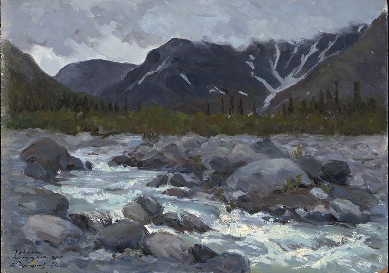 Композиция горизонтального формата. На первом плане изображена небольшая порожистая речка, или ручей. На втором плане виднеется чахлый хвойный лес, над которым виднеется высокая серая гора, вершину которой прикрывает частично облако. В расселинах горы лежит снег. Небо покрыто светло-серыми облаками.