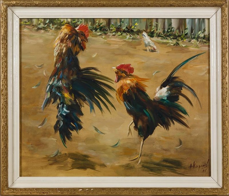Композиция горизонтального формата, основная колористическая гамма теплая. Изображена крупным планом драка двух петухов: самец слева подпрыгнул вытянувшись вертикально в вверх, оперение его распушено, крылья раскрыты и вытянуты вперед. Петух справа стоит на одной левой ноге, правая поджата вверх. Голова поднята вверх, взгляд направлен на соперника. Птицы изображены на фоне голой охристо-желтой земли, вокруг валяются вырванные перья. Справа вдали видна белая курица, клюющая что-то на земле возде забора.