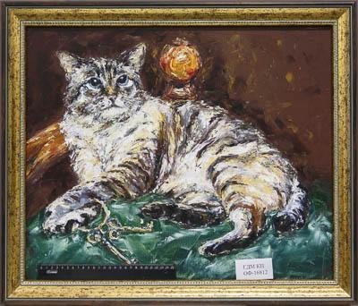 Композиция горизонтального формата, изображён серый полосатый кот (помесь сиамской и бирманской пород), лежащий на зеленом кресле со связкой ключей возле его левой лапы, которой он как бы прикрывает саму связку в виде кольца. Фон коричневый.