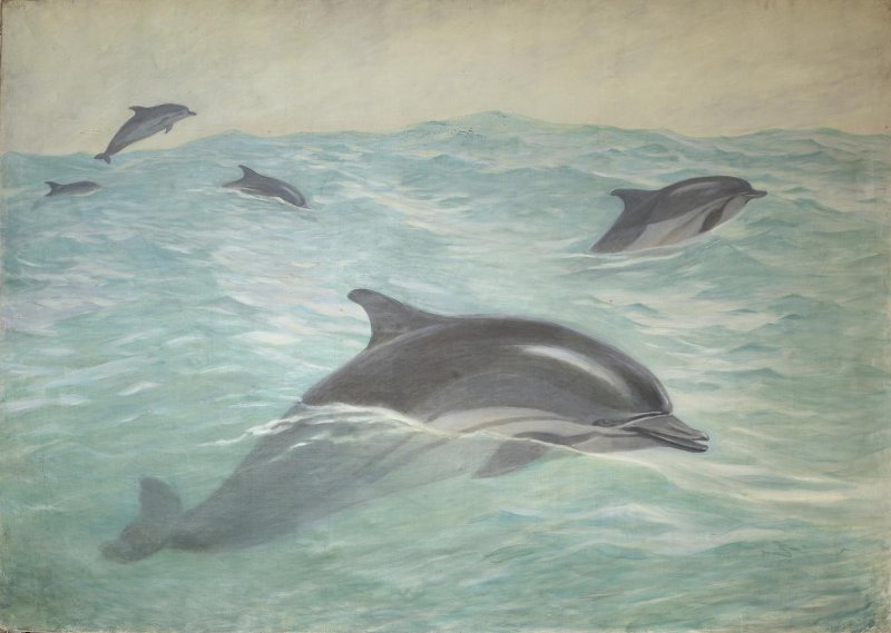 На картине горизонтального формата изображена плывущая стайка из пяти дельфинов. Основная колористическая гамма холодная. До горизонта простирается зеленовато-голубое море, покрытое небольшими волнами. Небо над ним светло-серое. На первом плане изображен плывущий дельфин: передняя часть его тела со спинным плавником находится над поверхностью воды. Тело дельфина сверху черное, также как и передний плавник, а живот светло-серый. На боку видна узкая темная полоска. На втором плане справа плывет второй дельфин, а на третьем плане слева - группа из трех дельфинов. У двоих из них над поверхностью воды виднеются только блестящие черные спины с плавниками, а третий, выпрыгнув из воды, высоко взлетел над волнами. Краски наложены тонкими лессировочными слоями, фактура мазка не видна.