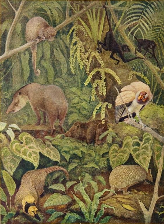 Иллюстрация фауны Центрально-Американской подобласти там, где она граничит с Гвиано-Бразильской подобластью. На картине вертикального формата на фоне тропической растительности, среди которой выделяется наклонённое дерево с серо-оливковым стволом, внизу на первом плане изображены слева носуха, над ней три крупных листа, справа броненосец, над ним два таких же крупных листа. На среднем плане слева стоит тапир в профиль влево, в центре два коричневых пекари, справа королевский гриф. Вверху слева изображен сидящий на ветке цепкохвостый дикобраз, вверху справа на фоне ствола дерева - две черные обезьяны.