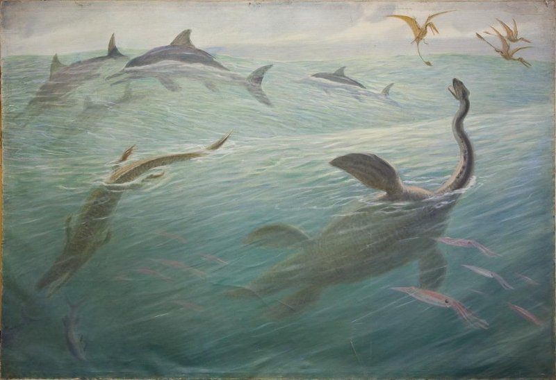 Картина горизонтального формата, основная колористическая гамма холодная. Изображена поверхность юрского моря с его различными обитателями. Линия горизонта располагается высоко, у верхнего края картины. Небо серое, кое-где видны желтоватые просветы в облаках. Море у горизонта светлое, аквамариновое. На первом плане вода темнее, холодного изумрудно-зеленого оттенка. На поверхности воды играют легкие блики лимонно-желтого, светло-фиолетового и белого цвета. На первом плане картины изображены мозазавр и плезиозавр. Справа расположен высунувший из воды голову на длинной шее и левый передний ласт плезиозавр. Пасть его раскрыта, части тела, находящиеся над водой, имеют голубовато-серую окраску с темными пятнами. Освещенные части покрыты теплыми золотисто-желтыми бликами. Туловище, скрытое под водой – зеленовато-серое. Перед плезиозавром плывет стайка из семи розовых, похожих на кальмаров, белемнитов. Еще шесть белемнитов еле виднеются в толще воды позади ящера. Слева на переднем плане виден ныряющий в погоне за двумя рыбами мозазавр. Над водой видны только его хвост и задние лапы. Пасть мозазавра раскрыта, окраска его подобна окраске плезиозавра. На заднем плане нарисованы четыре плывущих справа налево ихтиозавра, похожие на дельфинов. Их блестящие голубовато-серые спины отливают фиолетовым. Справа виднеются летающие вдали над водой три охристо-желтых рамфоринха с длинными хвостами. Краски наложены тонкими, лессировочными слоями.