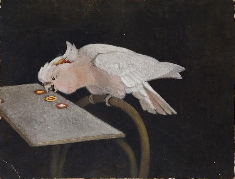 На листе горизонтального формата, на черном фоне изображен светло-розовый попугай с красным и желтым пером в прижатом хохолке. Он сидит на спинке венского стула, смотрит влево, его фигура горизонтально вытянута, он тянется к дощечке с тремя красно-бело-желтыми кружками, его раскрытый клюв расположен над центральным кружком.