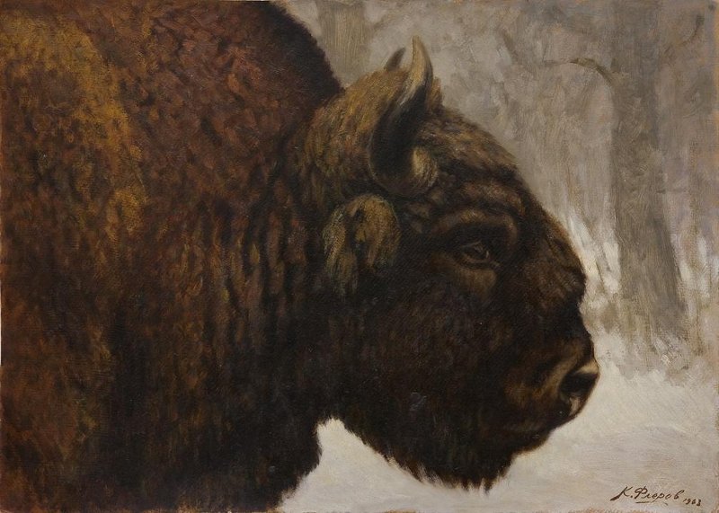 На картоне горизонтального формата крупно в профиль, занимая большую половину листа, изображена голова зубра с коричневой шерстью, в правой части изображен зимний лесной пейзаж в серо-жемчужных тонах.