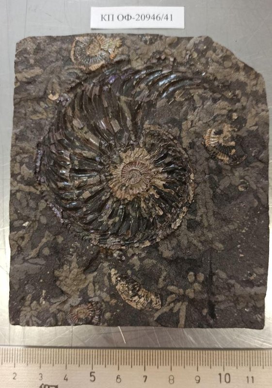 Слепок раковины аммонита на вмещающей породе - чёрных биотурбированных слюдистых глинах. Раковина спирально-плоская, полуэволютная, килеватая. Перламутровая раковина сохранилась частично - преимущественно в пупковой части. Поверхность раковины покрыта резкими С-образными рёбрами.
