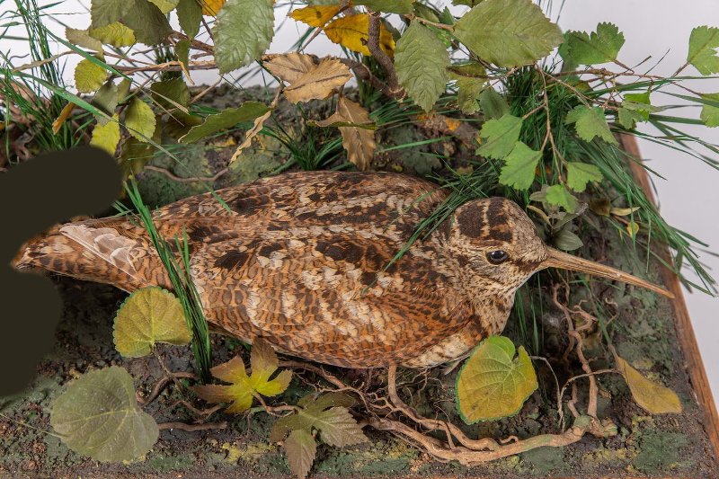 Чучело в биогруппе. Вальдшнеп. Scolopax rusticola L.,1758. Классификация: Хордовые Chordata, Позвоночные Vertebrata, Птицы Aves, Ржанкообразные Charadriiformes, Бекасовые Scolopacidae, Вальдшнеп Scolopax rusticola L.,1758