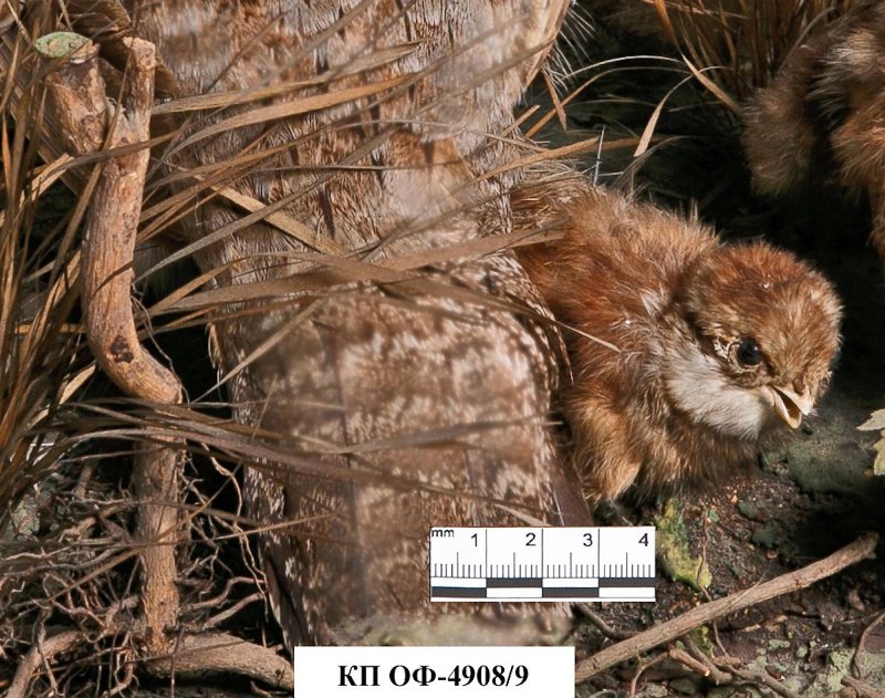 Чучело в биогруппе. Рябчик (птенец). Tetrastes bonasia (L.,1758). Классификация: Хордовые Chordata, Позвоночные Vertebrata, Птицы Aves, Курообразные Galliformes, Тетеревиные Tetraonidae, Рябчик Tetrastes bonasia (L.,1758)