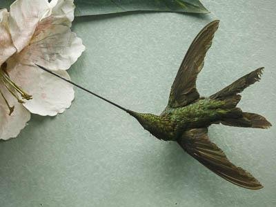 Чучело. Мечеклювый колибри. Ensifera ensifera (Boissoneau,1839). Классификация: Хордовые Chordata, Позвоночные Vertebrata, Птицы Aves, Стрижеобразные Apodiformes, Колибри Trochilidae, Мечеклювый колибри Ensifera ensifera Boissoneau,1840