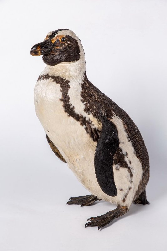 Чучело. Очковый пингвин. Spheniscus demersus (L.,1766). Классификация: Хордовые Chordata, Позвоночные Vertebrata, Птицы Aves, Пингвинообразные Sphenisciformes, Пингвиновые Spheniscidae, Очковый пингвин Spheniscus demersus (L.,1758)