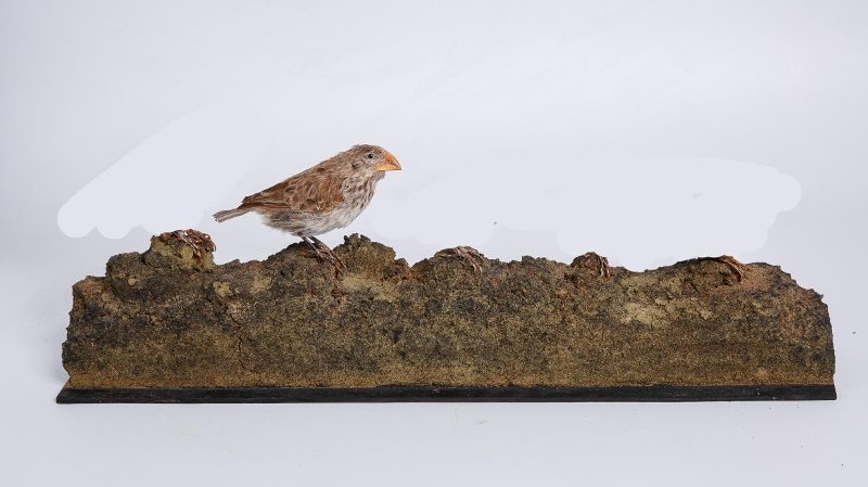 Чучело. Cредний земляной вьюрок. Geospiza fortis Gould,1837. Классификация: Хордовые Chordata, Позвоночные Vertebrata, Птицы Aves, Воробьинообразные Passeriformes, Танагровые Thraupidae, Средний земляной вьюрок Geospiza fortis Gould,1837