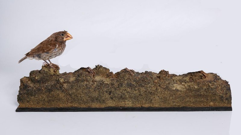Чучело. Большой земляной вьюрок. Geospiza magnirostris Gould,1837. Классификация: Хордовые Chordata, Позвоночные Vertebrata, Птицы Aves, Воробьинообразные Passeriformes, Танагровые Thraupidae, Большой земляной вьюрок Geospiza magnirostris Gould,1837