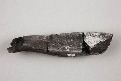 Фрагмент кости ихтиозавра. Удлинённой формы. Пористый. Хрупкий. Чёрного цвета.