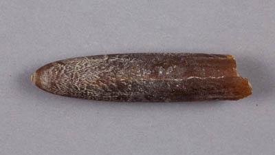 Ростр крупного белемнита. Ростр конической формы, округло-треугольный в поперечном сечении. Альвеола сравнительно узкая и короткая, очень толстостенная. Вся поверхность ростра покрыта отпечатками кровеносных сосудов. Фрагмакон и терминальный шипик на апикальном конце ростра не сохранился. Брюшная борозда не видна, но в пределах альвеолы есть спайка. Окраска образца - коричневая.