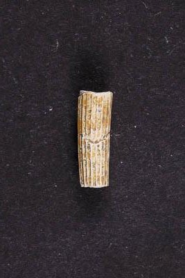 Фрагмент трубчатой роговидноизогнутой раковины лопатоногого моллюска. Апикальная часть раковины не сохранилась. Скульптура поверхности раковины – частые плоские продольные рёбра. Хрупкая.