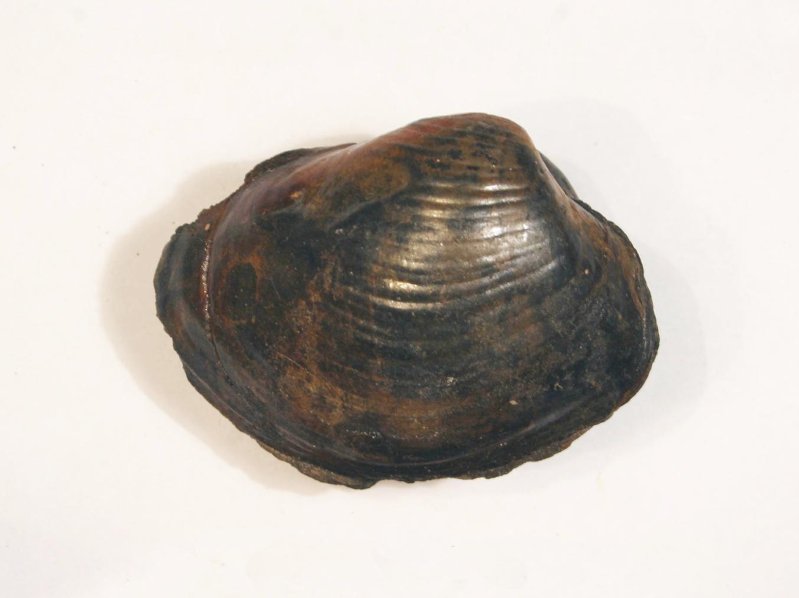 Внешнее ядро раковины двустворчатого моллюска. Раковина продолговатая треугольно-овальная, равностворчатая, неравносторонняя, беззубая; макушки приближены к переднему краю и загнуты внутрь; связка наружная; мантийный синус более или менее глубокий; скульптура из концентрических линий и морщин. Окраска образца - тёмно-бурая, почти чёрная.