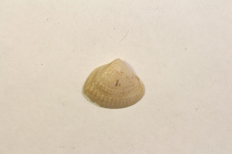 Створка раковины с радиально-ребристой скульптурой. Цвет молочно-белый.