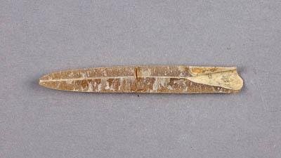 Фрагмент ростра белемнита. Ростр веретёновидной формы, расколотый вдоль. Склеен из двух кусков.. Альвеола узкая и относительно не глубокая, закрыта пробкой из вмещающей породы. Поперечное сечение - вертикально-эллиптическое в приустьевой части и овальное, несколько сплющенное в спино-брюшном направлении - в апикальной части. Брюшная борозда - отсутствует. На спинной стороне ростра, в апикальной части - отпечатки кровеносных сосудов в виде неясных неглубоких парных канавок. Фрагмакон и хвостовой терминальный шипик не сохранились. Общая окраска образца - янтарно-коричневая, полупрозрачная.