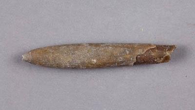 Ростр белемнита. Ростр веретеновидной формы. Поперечное сечение в приустьевой части - вертикально-эллиптическое, в апикальной - округло-треугольное, несколько сжатое в спино-брюшном направлении. Альвеола относительно узкая и не глубокая. Снаружи альвеола закрыта пробкой из вмещающей породы.. Хвостовой терминальный шипик и фрагмакон - отсутствуют. В целом ось ростра смещена к брюшной части. На спинной поверхности ростра, в его апикальной части, видны неясные отпечатки кровеносных сосудов и следы деятельности сверлящих губок. Общая окраска - светло-коричневая.