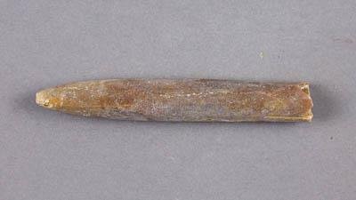 Ростр белемнита. Ростр веретёновидной формы. Поперечное сечение в приустьевой части - вертикально-эллиптическое, в апикальной - округло-треугольное, несколько сжатое в спино-брюшном направлении. Альвеола относительно узкая и не глубокая, закрытая пробкой из вмещающей породы. Хвостовой терминальный шипик и фрагмакон - отсутствуют. В целом ось ростра смещена к брюшной части. На спинной поверхности ростра, в его апикальной части, видны неясные отпечатки кровеносных сосудов. Общая окраска образца - грязно-коричневая.