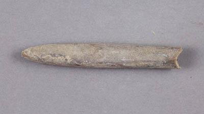 Ростр белемнита. Ростр веретеновидной формы. Поперечное сечение в приустьевой части - вертикально-эллиптическое, в апикальной - округло-треугольное, несколько сжатое в спино-брюшном направлении. Альвеола относительно узкая и не глубокая. Снаружи альвеола закрыта пробкой из вмещающей породы.. Хвостовой терминальный шипик и фрагмакон - отсутствуют. В целом ось ростра смещена к брюшной части. На спинной поверхности ростра, в его апикальной части, видны неясные отпечатки кровеносных сосудов. Поверхность ростра растворена. Общая окраска образца - серая.