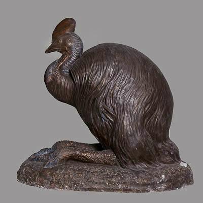 Скульптурное изображение сидящего казуара на подножии. Птица сидит, опираясь на подставку плюснами вытянутых вперед лап. Казуар словно бы нахохлился, S-образно изогнутая шея прижата к туловищу, голова чуть повернута направо. Фактура оперения и кожи птицы тщательно передана рельефом. Скульптура тонирована в темно-коричневый цвет.